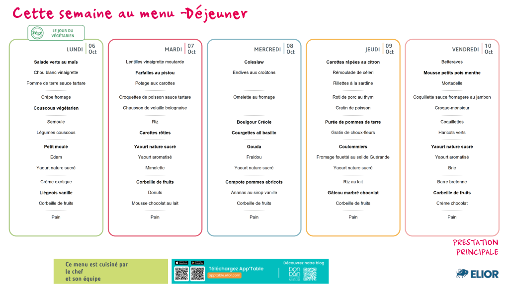 Très engagés dans la lutte anti-gaspillage et dans l’éducation alimentaire des enfants, Elior proposera à vos enfants :