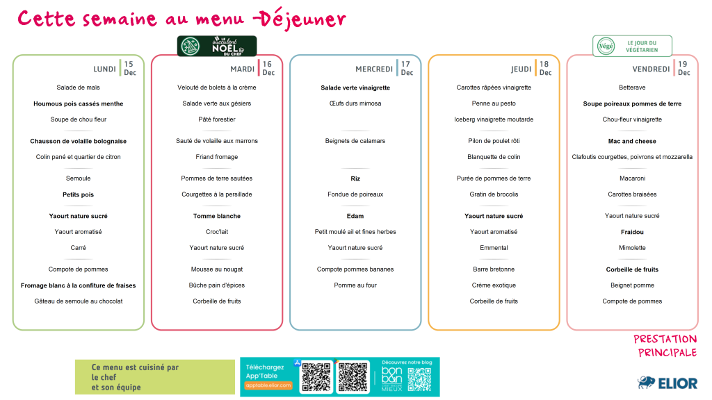 L’équipe de cuisine régalera vos enfants avec des recettes issues du patrimoine culinaire d’Elior créées par nos chefs experts